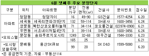 강남구 청담동에서는 한양아파트를 재건축한 '청담자이'가 일반분양을 시작한다. 총 708가구 중 일반분양은 16가구며 전용면적은 49~90㎡다. 후분양 아파트로 오는 10월 입주할 예정이다.