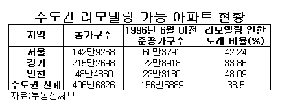 지역별로는 인천이 48.1%(48만4860가구 중 23만3180가구)로 리모델링 대상 아파트가 가장 많았다. 서울은 142만9268가구 가운데 42.2%인 60만3791가구, 경기도는 215만2698가구 가운데 33.9%인 72만8918가구 등이 리모델링 대상 아파트로 조사됐다.