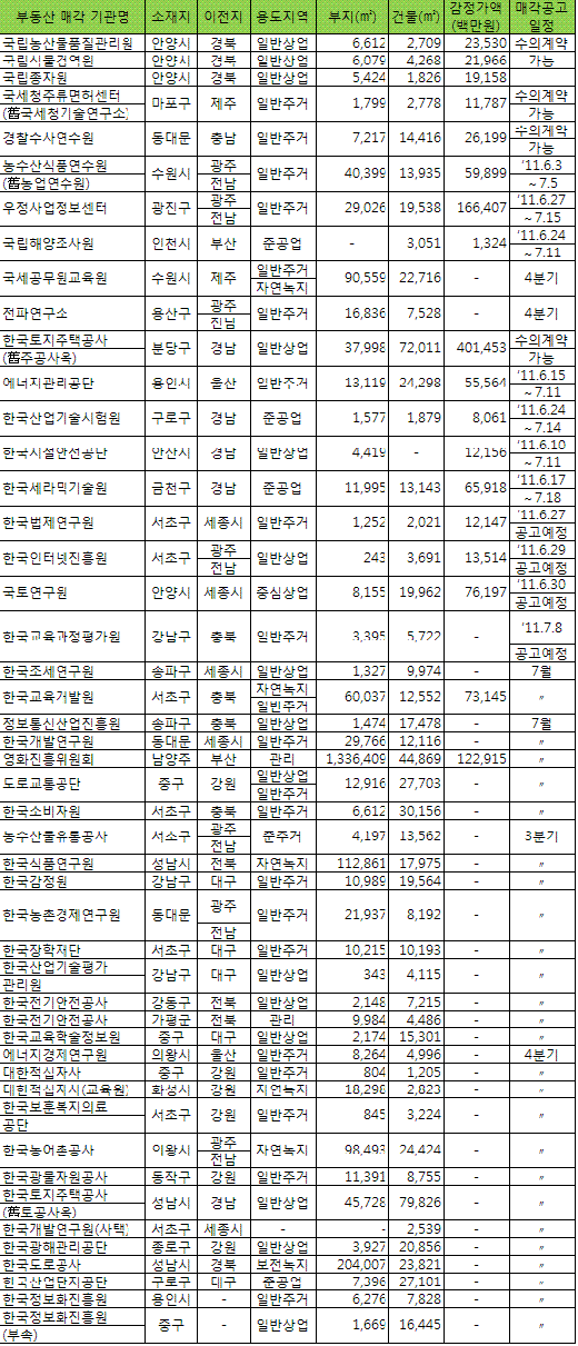 그동안 일반매각에서 유찰된 부동산은 LH공사만 매입할 수 있었지만 7월부터 '혁신도시특별법시행령'이 개정되면 농어촌공사, 자산관리공사, 지방공기업 등도 매입할 수 있다. 이에 따라 부동산 매각이 하반기부터 차질없이 이뤄질 것으로 국토부는 기대했다.