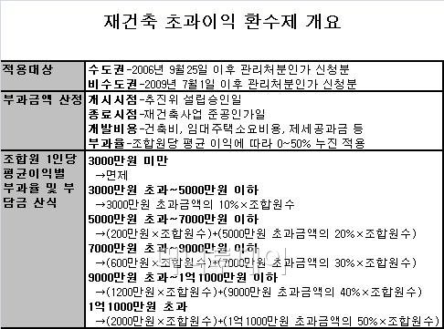 정부는 최근 논란이 되고 있는 재건축 초과이익환수제와 관련, '완화' 쪽으로 가닥을 잡았다. 임태모 국토해양부 주거정비과장은 30일 "집값이 안정되면서 재건축 초과이익환수제에 대한 폐지와 완화 논란이 있지만 제도 도입 취지를 감안해 완화 쪽으로 결정됐다"고 말했다.