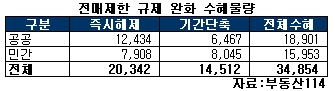주택유형별로는 공공택지 아파트가 1만8901가구(즉시 해제 1만2434가구, 기간 단축 6467가구), 민간택지 아파트는 1만5953가구(즉시 해제 7908가구, 기간 단축 8045가구)다.