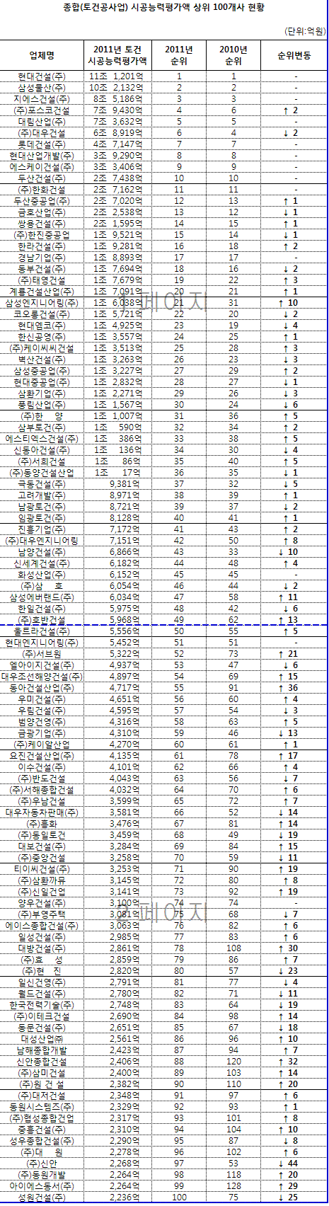 10위권에서 두 회사를 빼고 순위 변함이 없었다. 11위부터 20위에서는두산중공업(96,700원 ▲1,200 +1.26%)(13위→12위)쌍용건설(15위→14위)한라건설(3,205원 ▼30 -0.93%)(18위→16위)태영건설(1,711원 ▼17 -0.98%)(22위→19위) 계룡건설산업(21위→20위)이 순위 상승을 보였다.