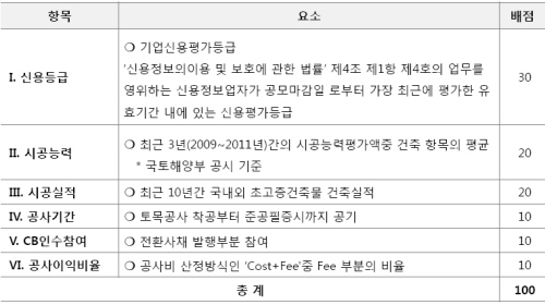 신용등급이 금리에 영향을 미치는 상황에서 A- 이상이면 모두 만점을 주는데다 가장 효율적인 '코스트+피(Cost + Fee)'를 제시하는 건설사를 구분하는 변별력도 없다고 업체들은 주장했다.