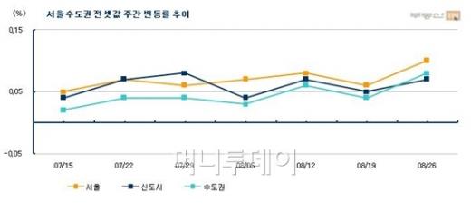26일 부동산정보업체인 부동산114에 따르면 이번주(8월2일∼8월26일) 서울아파트 전셋값은 지난주보다 0.10% 올랐다. 지역별로는 송파(0.17%) 양천(0.17%) 도봉(0.17%) 강동(0.16%) 등의 상승폭이 컸다.