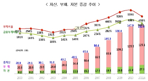 특히 상반기 실적에서 가장 고무적으로 평가되는 점은 경영정상화의 가장 큰 장애요인으로 꼽혔던 부채 증가 속도가 크게 주춤해졌다는 것이다. 상반기 결산 결과 자산 152조원, 자본 27조3000억원, 부채 125조원 등으로 부채비율은 지난해 말 559%에서 101% 감소한 458%를 기록했다.