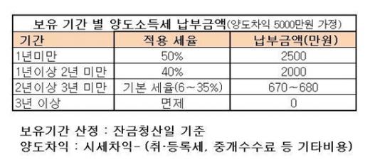 예컨대 양도차익이 5000만원일 경우 보유기간에 따라 670만~2500만원의 세금 차이가 난다. 1년 미만 보유 시엔 50% 중과율을 적용받아 2500만원을 양도세로 납부해야 한다. 1년 이상 2년 미만 보유했다면 40%가 적용돼 2000만원을, 2년 이상 3년 미만은 기본세율이 적용돼 약 670만∼680만원을 납부해야 한다. 3년 이상 보유하면 면제다.