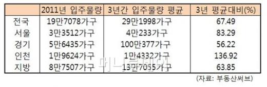 1일 부동산정보업체 부동산써브가 올해 지역별 입주물량을 지난 3년간(2008∼2010년)평균치와 비교한 결과 대전(196%) 인천(136%) 부산(88.19%) 충남(86%) 서울(83%) 순으로 입주물량이 많은 것으로 조사됐다. 반면 강원(25%) 울산(28.04%) 대구(34.73%)의 올 입주물량은 3년 평균치의 절반에도 한참 못미칠 만큼 적은 것으로 파악됐다.