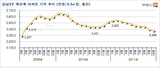 이에 따라 강남3구 재건축 아파트의 전용 3.3㎡당 매매가격은 지속적으로 낮아지고 있다. 올 2월 3.3㎡ 당 평균 3530만원까지 오르며 회복세를 보였던 강남3구 재건축 아파트 값은 10월 현재 3.3㎡당 평균 3369만원까지 떨어졌다. 이는 지난해 연저점이었던 9월 3431만원보다 낮은 수준이다.