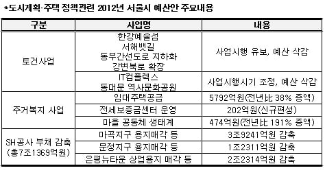 반면 서민주거 안정을 위한 정책에는 예산은 늘었다. 우선 박 시장의 임기내 임대주택공급 8만가구 공약 이행을 위해 시는 내년 공공임대주택건설 등에 필요한 예산으로 5792억을 책정했다. 이는 올해 예산 4193억9500만원에 비해 38% 가량 늘어난 수준이다.