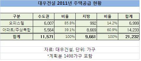 대우건설은 지난 2008년부터 주택공급이 상대적으로 부족했던 지방의 경우 3~4인 가구 수요가 많은 아파트와 주상복합을, 1~2인가구 수요가 많은 수도권의 경우 오피스텔과 도시형생활주택을 공급하는 이른바 시장분리 전략을 구사했다.