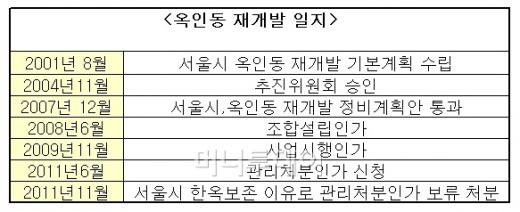 실제 서울시는 지난 11월2일 '윤덕영가'(서울시 민속자료 23호)와 추사 김정희의 '바위글씨' 등 문화재가 보존돼 있다는 이유로 종로구 옥인동 재개발사업을 관리처분 단계에서 보류했다.