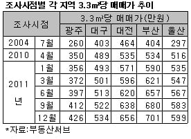 15일 부동산정보업체 부동산써브가 수도권을 제외한 지방 5대 광역시(광주·대구·대전·부산·울산) 143만8701가구를 대상으로 3.3㎡당 매매가를 조사한 결과 사상 최고치인 600만원으로 조사됐다.