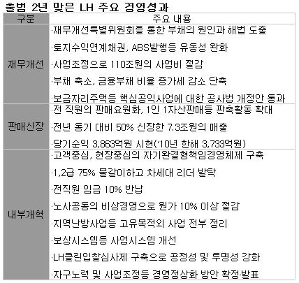 LH는 이처럼 출범후 '고객중심, 업무중심'으로 조직을 개편하고 업무 프로세스와 시스템을 혁신한 성과가 곳곳에서 드러나면서 진정한 '국민공기업'으로 변신하고 있다는 평가다.