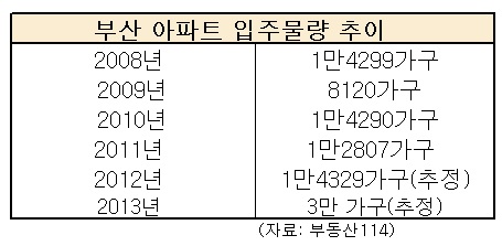 입주 물량이 집중될 경우 웃돈은 커녕 가격 하락으로 이어질 수 있다는 점에서 부동산 투자심리에 찬물을 끼얹을 것이란 예측이다. 관련업계에 따르면 내년 부산시내 입주예정 물량은 3만가구로 추정된다.