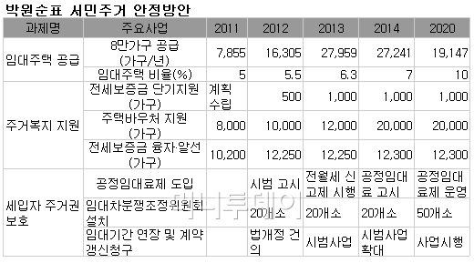 박원순 서울시장의 서민주거 안정방안이 최종 확정됐다. 핵심은 △공공임대주택과 주거복지 확대 △전·월세 세입자 주거권 보호 △전면철거방식 정비사업 지양 등으로 모아진다.