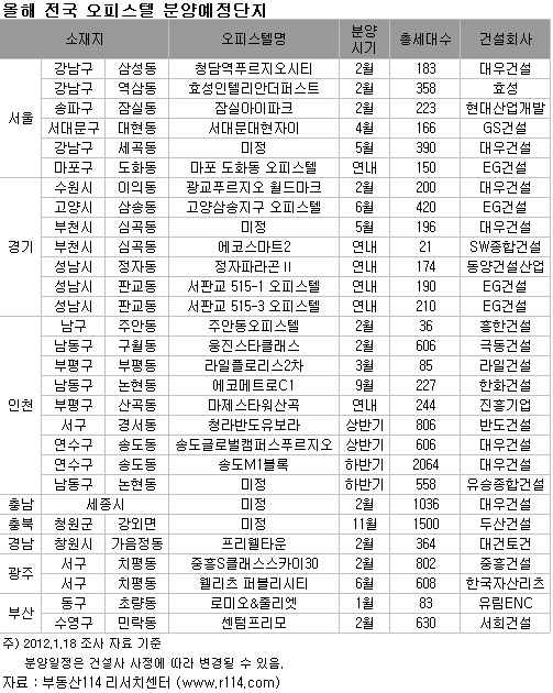 부동산정보업체 부동산114가 잠정 집계한 올해 오피스텔 분양물량은 전국 29개 사업장, 1만3136실이다. 여기에 중소건설사들의 공급물량을 포함하면 분양예정 사업장은 더 늘어날 것으로 보인다.