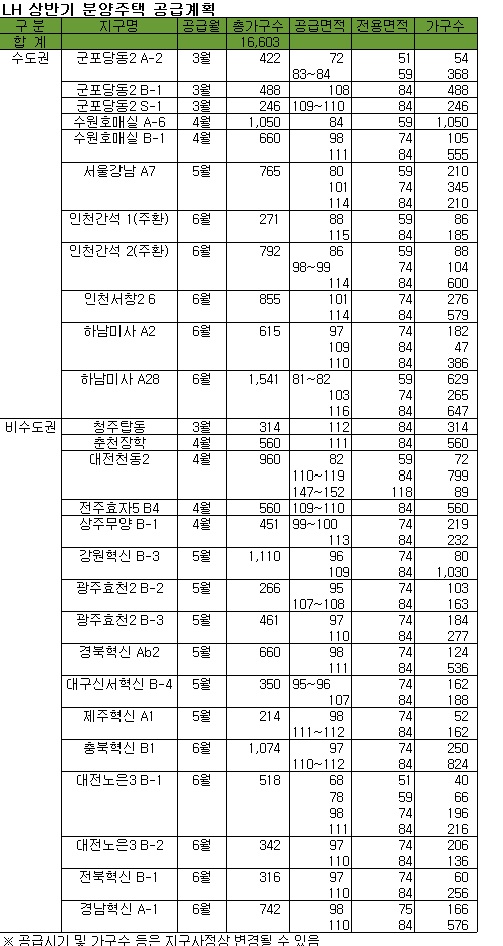 한국토지주택공사(LH)가 상반기에만 수도권 보금자리주택지구와 혁신도시, 전국 택지개발지구에서 총 1만6603가구를 신규 분양한다. 국민임대와 5·10년 임대 등 임대주택도 전국에 1만5949가구를 공급한다.