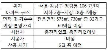8일 부동산업계에 따르면 강남구 청담동 106-7번지 일대 3202㎡에 32가구를 짓는 고가아파트가 오는 6월 착공된다. 지하 3층~지상 18층 2개동으로, 한개동에 16가구씩 들어선다.