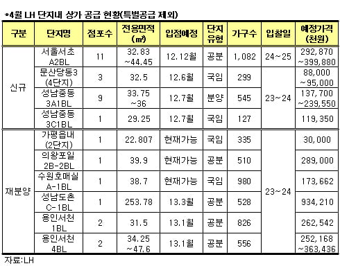 16일 LH에 따르면 이달 중 새로 공급되는 LH 단지내 상가는 서울 서초보금자리주택지구, 경기 파주 문산당동지구, 경기 성남 중동지구에서 특별공급을 제외한 24개 점포다. 여기에 경기 가평과 의왕, 수원 등 6개 단지에서 8개 점포가 재분양을 앞두고 있다.