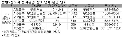 7일 건설·부동산업계에 따르면 6월 중 동탄2신도시에서 동시분양에 나설 업체는 △GS건설 A10블록(전용면적 72~84㎡) 559가구 △롯데건설 A28블록(101~241㎡) 1416가구 △우남건설 A15블록(59~84㎡) 1442가구 △호반건설 A22블록(84㎡) 1002가구 △KCC건설 A27블록(84㎡) 640가구 △모아종합건설 A25블록(84㎡) 460가구 등이다.