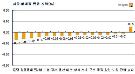 11일 부동산정보업체 부동산114에 따르면 이번주(5월7~11일) 서울아파트값은 전주보다 0.01% 떨어졌다. 신도시와 경기·인천도 모두 0.01% 하락했다. 서울 아파트값은 저가, 급매물 간헐적인 거래와 매물회수로 송파구(0.05%)만 가격이 상승했다. 잠실동 잠실주공5단지와 신천동 진주아파트 등이 500만~2000만원 가량 가격이 올랐다.