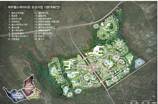 헬스케어타운 조성사업은 제주도를 국제자유도시로 조성하기 위한 6대 핵심프로젝트 사업 중 하나다. 제주 서귀포시 동흥·토평동 일대 153만9000㎡ 부지에 7845억원의 사업비를 투입해 오는 2015년까지 조성하는 것이 목표다.