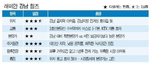 그럼에도 '래미안 강남 힐즈'가 안고 있는 호재는 적지 않다. 우선 의무 거주요건이 없고 계약 후 1년 뒤에 전매도 가능한 점은 매력적이다. 지하철 3호선·분당선 수서역과 버스로 5~7분 거리에 위치해 대중교통 이용이 편리하다.