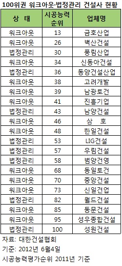 5일 건설업계에 따르면 시공능력평가 순위(2011년 기준) 100위권 건설사 가운데 현재 워크아웃과 법정관리중인 곳은 각각 13개, 8개로 총 21개 회사가 경영정상화를 진행중이다.