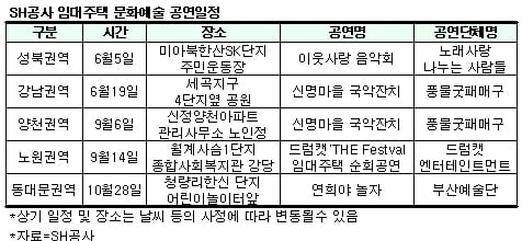 서울시 산하 SH공사(사장 이종수)가 임대주택 입주민의 문화생활을 돕기 위한 임대아파트 문화예술 공연을 진행한다.