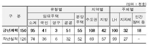 정부는 올해 주택건설 인·허가 계획을 주택수요(43만가구)와 주택시장 상황, 지난해 인·허가실적 등을 감안해 45만가구(수도권 25만가구, 지방 20만가구)로 계획했다. 올해부터는 주택건설 인허가 계획과 함께 국민들의 실제 체감도를 높이기 위해 주택착공과 입주물량 계획도 함께 수립했다.