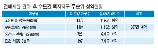 같은 달 16일부터 18일까지 사흘간 무순위 청약을 받은 수원 호매실지구는 1304가구 모집에 1110명이 청약, 경쟁률은 0.85대 1에 머물렀다. 특히 수원 호매실지구는 367가구만 계약, 분양률이 21%에 머물렀다. 이어 725가구를 무순위로 공급한 의정부 민락2지구는 6가구, 197가구를 분양한 인천 서창2지구도 7가구만 계약하는데 그쳤다.