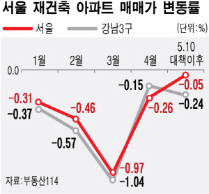 정부가 부동산시장 활성화를 위해 재건축 규제를 완화하는 내용을 포함한 5·10대책을 내놨지만 재건축시장은 여전히 인·허가권을 가진 서울시의 눈치만 본다. 대책 자체가 실효성을 담보하기 어려울 것이란 지적에다 인·허가권을 쥔 서울시가 여전히 공공성 확보를 조건으로 재건축 승인에 미온적인 입장을 취하고 있어서다.