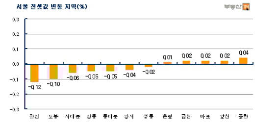 광진구는 전세를 찾는 수요가 크게 줄었고 매물이 쌓이면서 구의동 현대프라임, 현대2단지 등이 500만원 정도 내렸다. 도봉구는 창동 동아, 동아청솔1.2차 등 전셋값이 250만~500만원 가량 빠졌다. 서대문구는 북가좌동 일신휴먼빌, 한양, 북가좌삼호 등 전셋값이 500만원 가량 떨어졌다.