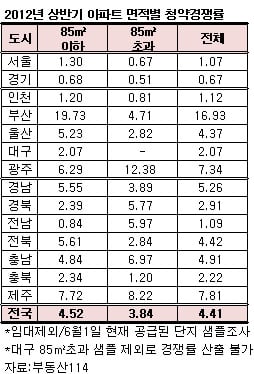 16일 부동산정보업체인 부동산114에 따르면 올 상반기 공급된 분양 단지의 면적별 청약 경쟁률은 85㎡(이하 전용면적)이하가 85㎡초과 보다 높게 나타났다. 지역별로 보면 서울은 85㎡ 초과 중대형의 경우 0.67대1로 미달 경쟁률을 보였지만 85㎡ 이하 중소형은 1.3대 1로 중대형의 2배가 넘는 경쟁률을 보였다.