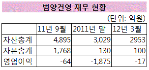 법정관리 신청 이후 범양건영의 자산가치가 급격히 줄어든 점도 논란거리다. 범양건영 자산 총계는 법정관리 신청전인 2011년 9월말 4895억원이었으나, 이후인 2011년말 기준엔 3029억원으로 크게 줄었다.