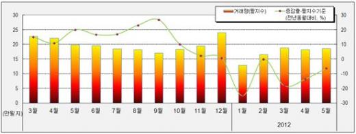22일 국토해양부에 따르면 5월 전국 지가는 전달에 비해 0.11% 상승해 지난 2010년 11월 이후 19개월째 오름세를 이어갔다. 현재 지가는 금융위기 발생 전 고점이던 2008년 10월에 비해 0.54% 낮은 수준이다.