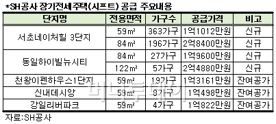 SH공사는 홈페이지(www.i-sh.co.kr)와 게시판을 통해 오는 다음달 20일 서류심사 대상자를 발표하고 8월31일 당첨자를 공고할 계획이다. 계약기간은 9월17~21일이고 입주는 잔여공가와 동일하이빌뉴시티는 단지별로 10~12월까지다. 신규단지인 서초네이처힐 3단지는 내년 2~4월 입주 예정이다.