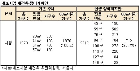 정비안의 소형(전용면적 59㎡이하)주택비율 21.88%가 시 기준에 못 미친다는 이유에서다. 이에 재건축 추진위원회는 지난달 입주민들을 대상으로 설문조사를 벌여 소형주택 비율을 30%까지 끌어올렸다.