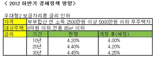 28일 정부가 발표한 하반기 경제정책방향에는 △우대형2 보금자리론 금리 생애최초주택구입자금대출 수준으로 인하 △표준임대차계약서 개정 △임대료 소득공제 확대 △임대보증금 반환지연시 임차인에 보증 지원 등이 담겼다.