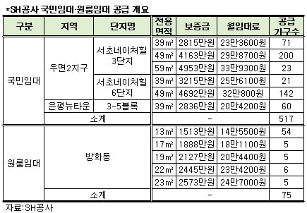 지역별로는 △우면2지구 서초네이처힐 3·6단지 39㎡(이하 전용면적) 92가구, 49㎡형 342가구, 59㎡형 23가구 △은평뉴타운 3-5블록 39㎡형 60가구 △방화동 원룸임대 13㎡형 54가구, 17㎡형 5가구, 19㎡형 5가구, 22㎡형 6가구, 23㎡형 5가구 등이다.