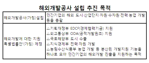해외개발공사는 △기획재정부 EDCF(경제협력기금) 지원 △외교통상부 ODA(공적개발원조) 지원 △국토해양부 도시 수출 △지식경제부 전력·자원 개발 △농림수산식품부 농업 개발 등으로 분산돼 있는 개발지원 기능을 하나로 모아 민간기업의 해외개발 진출을 지원하는 것이 목적이다.