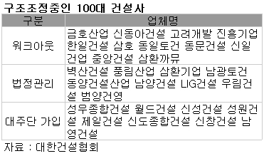 이중엔 금호건설, 벽산건설, 풍림산업, 신동아건설, 남광토건, 동양건설산업, 진흥기업, 남양건설, 우림건설, 동문건설, 범양건영, 중앙건설, 성우종합건설, 월드건설 등 과거 건설·주택산업을 주도했던 건설사들이 즐비하다.
