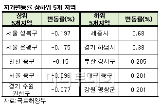 지가 하락폭이 세번째로 큰 중구의 경우엔 뉴타운 출구전략보다는 개별 정비사업장의 사업지연이 영향을 미친 것으로 분석했다. 국토부 관계자는 "조사대상 토지는 주택 등 건물의 부속토지인데 정비구역 해제 등으로 인해 집값이 떨어지면서 땅값도 동반 하락한 것"이라고 말했다.