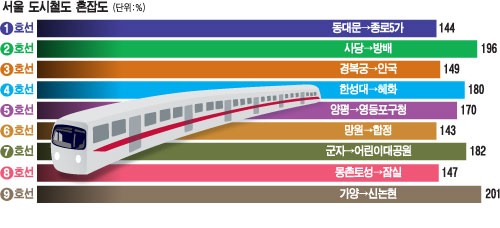 사정이 이렇다보니 대중교통을 이용하는 국민들의 불편도 지속되고 있다. 지난해 서울 도시철도 혼잡도는 9호선 201%, 2호선 196%, 1호선 144% 등 대부분 구간이 140%를 넘었다. 수도권에서 서울로 출퇴근하는 직장인들의 통근시간도 일본보다 25% 더 긴 것으로 분석됐다.