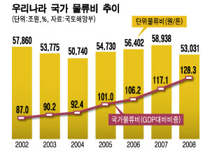 국토해양부에 따르면 우리나라의 단위물류비는 2004년 톤당 50.745원이었지만 2008년엔 63.031원으로 24.2% 급증했다. 교통혼잡비용은 2004년 23조1000억원에서 2008년 26조9000억원으로 16.5% 증가했다.