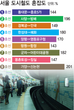 국토해양부 조사 결과 2010년말 기준으로 서울 거주자의 26%인 115만명과 경기·인천 거주자의 23%에 달하는 147만명이 매일 1시간 이상을 통근시간으로 낭비하는 것으로 나타났다.
