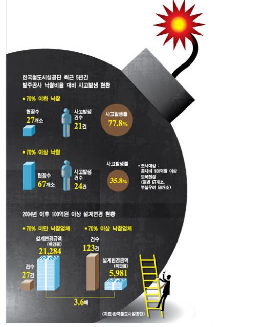 철도시설공단 관계자는 "그만큼 일단 저가투찰로 낙찰받고 설계변경을 통해 사업비를 보전받으려는 것으로 파악된다"며 "이중 워크아웃(기업개선작업)이나 법정관리(기업회생절차) 업체들의 저가입찰 참여가 많다"고 말했다.