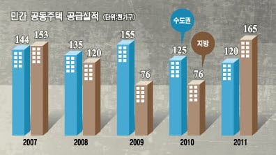 지방은 분양가상한제 이후 공급 감소로 수요가 늘면서 준공 후 미분양 물량이 꾸준히 줄었지만 수도권은 2007년말 1347가구에 불과하던 준공 후 미분양 물량이 지난 6월 1만가구를 돌파했다.
