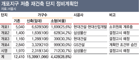 이들 아파트는 재건축사업이 완료될 경우 약 1만5400가구 규모의 대단지로 탈바꿈한다. 개포지구 재건축 단지들은 소형주택 추가 확보 외에 임대와 분양주택의 단지내 혼합배치 등을 골자로 하는 '소셜믹스'를 정비계획에 반영했다.