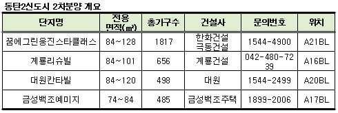 이들 2차 물량이 관심을 끄는 이유는 4개 단지 모두 커뮤니티 시범단지내 위치해 입지여건이 상대적으로 좋다는 평가 때문이다. 2차 동시분양 참여업체들에 따르면 커뮤니티 시범단지의 경우 KTX(고속철도) 복합환승센터인 동탄역과 광역비즈니스 컴플렉스를 걸어서 이용할 수 있다.